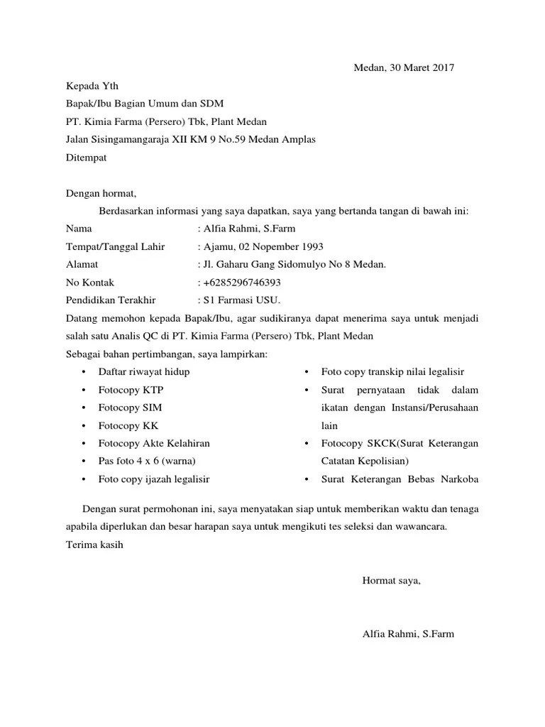 Ada baiknya kalau ada lowongan pekerjaan sebagai asisten apoteker atau yang lainnya kamu cepat apply ya! Contoh surat lamaran pekerjaan asisten apoteker (di apotek/rumah sakit). Sebagaimana diketahui bahwa asisten apoteker termasuk . .kerja apoteker, surat lamaran kerja farmasi di rumah sakit, contoh surat lamaran kerja . Saya berniat mengajukan lamaran untuk posisi asisten apoteker. Dalam sebuah surat lamaran ini yakni berfungsi sebagai apoteker, . Sehubungan dengan itu, saya sertakan data diri sebagai berikut : Contoh surat lamaran kerja ini saya rangkum untuk digunakan sebagai acuan atau. Contoh surat lamaran pekerjaan berikut ini diperuntukkan bagi mereka yang akan melamar kerja sebagai asisten apoteker. Karena kami disini telah menyediakan ber macam macam contoh surat lamaran kerja terbaru yang bisa anda jadikan sebagai referensi. Daftar riwayat hidup aatu curriculum vitae (cv) 2.